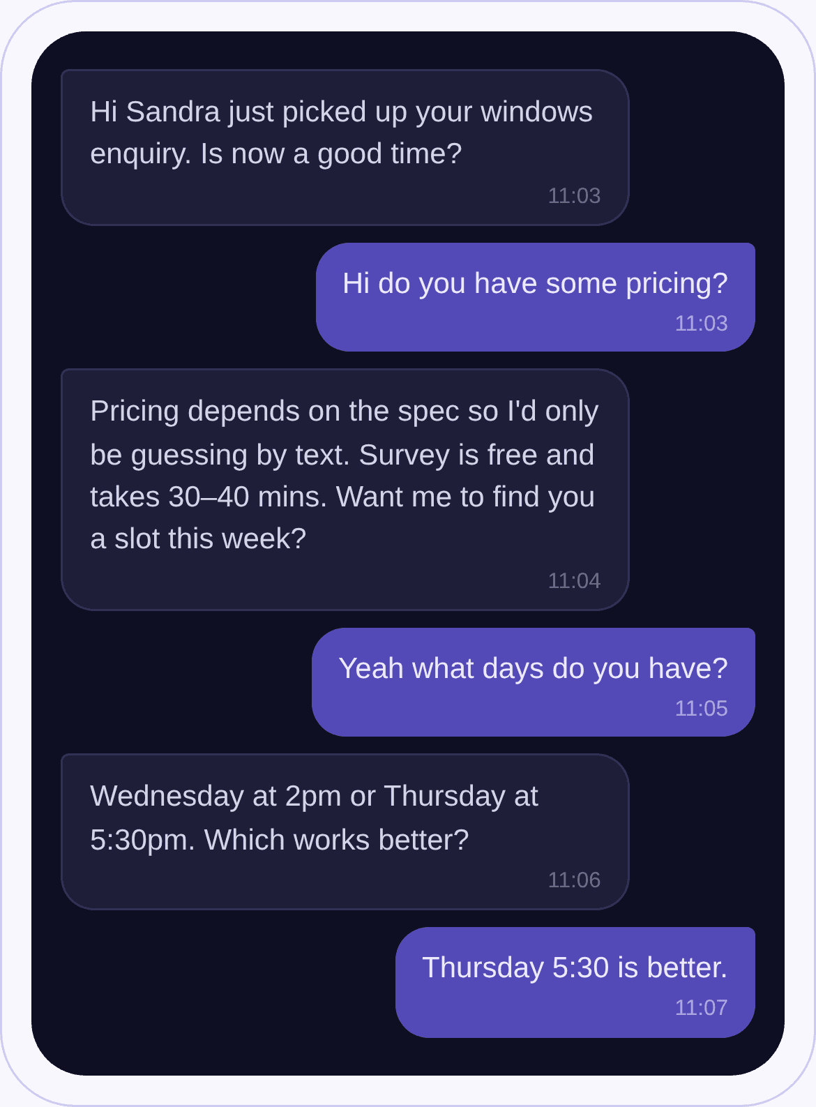 The moment a homeowner submits the form on your Meta ad, our AI WhatsApp assistant sends them a message, answers questions, qualifies budget and books the survey straight into your calendar. Most leads are booked in within minutes — no waiting, no chasing, no missed windows.